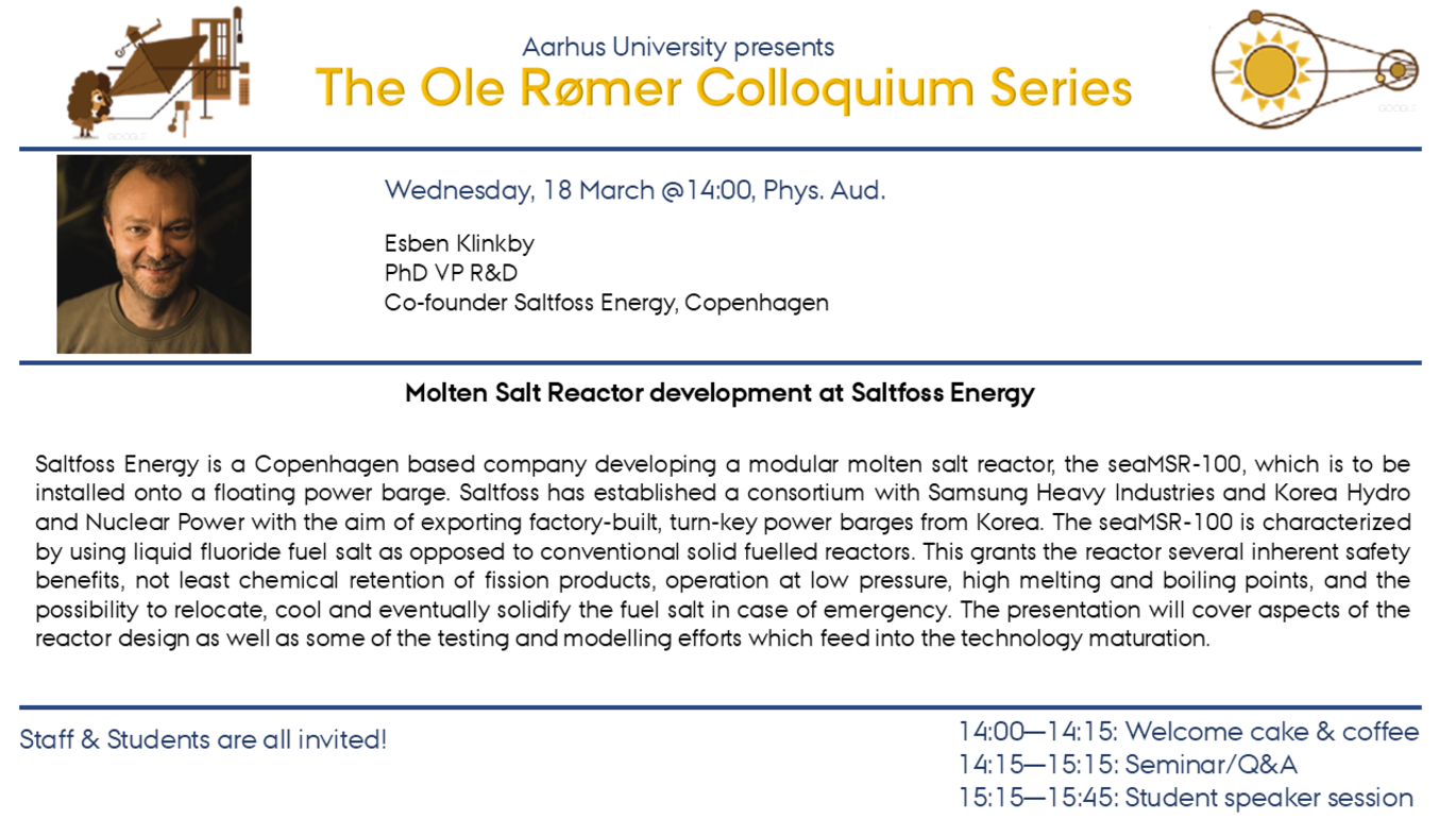 Ole Rømer Colloquium Join us for the next Ole Rømer Colloquium where Esben Klinkby, Saltfoss Energy, Copenhagen, will visit us Info about event Time Wednesday 18 March 2026, at 14:00 - 15:15 Add to calendar Location 1523-318