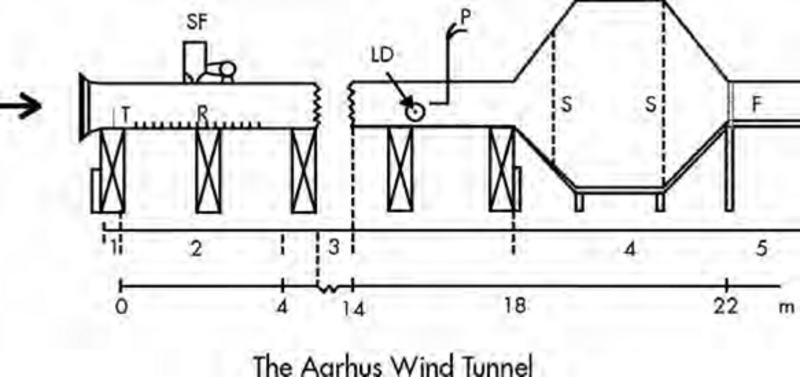 The working area is the section from 10-13 m downstream of the entry. The side panels of the tunnel body consists of a set of gates (windows) that can swing up thus permitting access to the interior. Another set of gates in the ceiling of the tunnel above the working section offer an alternative access to the working section. The latter set of gates is primarily used to install instruments which must be operated partly from the outside or connected to an external power supply or recording system.